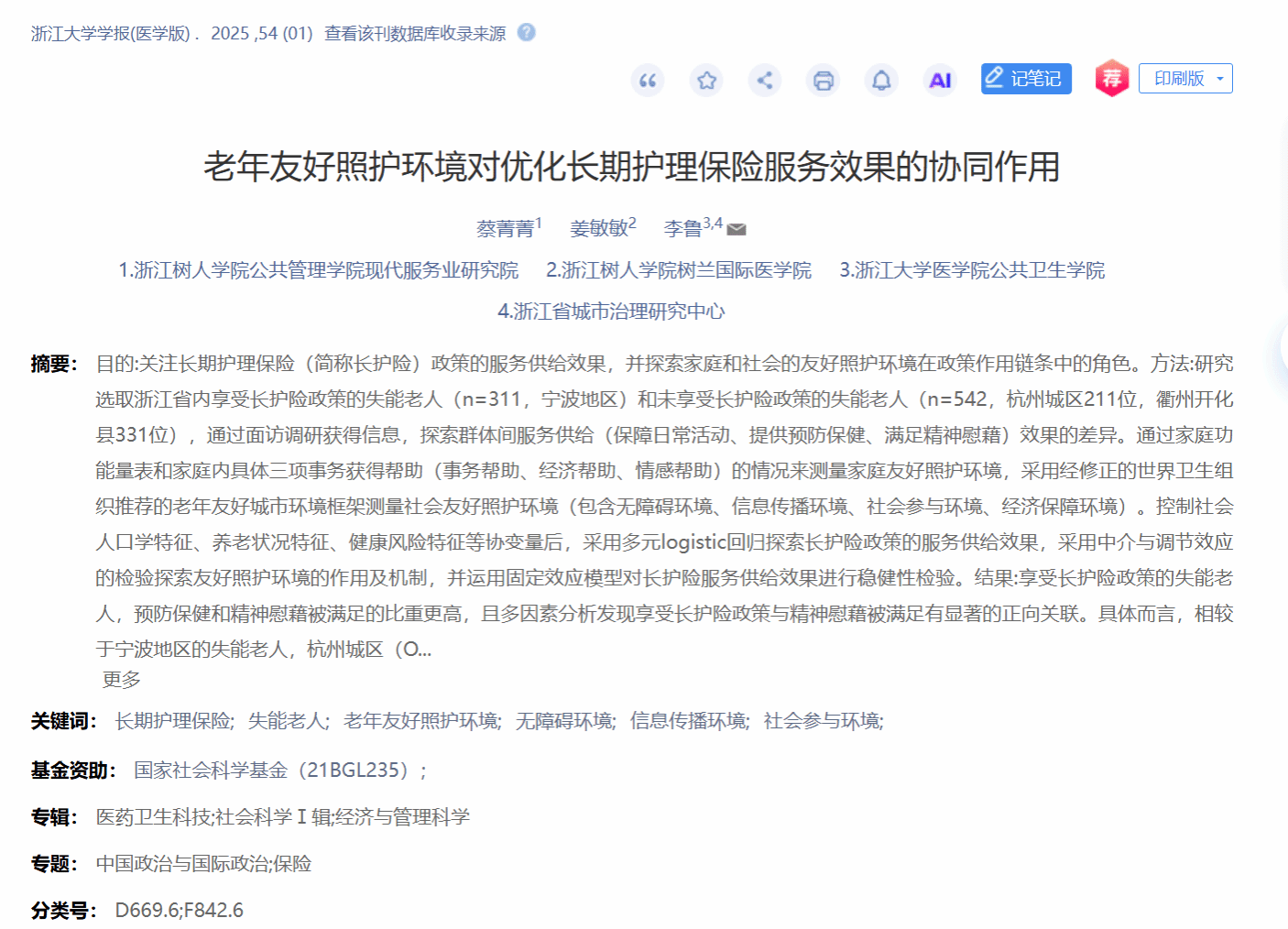 近日,我院蔡菁菁博士撰写的《老年友好照护环境对优化长期护理保险服务效果的协同作用》在浙大一级学术期刊《浙江大学学报(医学版)》上顺利发表。